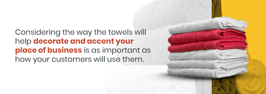It’s pretty clear the customers who patronize your business will use the colored towels you decide to buy every day — to dry their hair, their skin and to soothe and warm their faces. Considering the way the towels will help decorate and accent your place of business is as important as how your customers will use them.