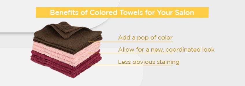 - Allow for a new, coordinated look: Don’t want to feel stuck with your salon decor? You can use colored towels to switch it up whenever you want. Strategically place towels around your salon in areas so customers see them as soon as they enter. You can also purchase some towels strictly for decoration and switch them out as needed. If you desire to create an environment to match or complement your salon brand colors, you can also use colored towels to pair two or three colors together.