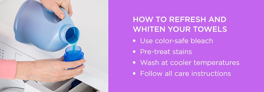 - Pay special attention to whites: White towels, especially, can lose the vibrancy and crispness that make them great. Wash your whites in their own load to avoid discoloration over time, and use non-chlorine bleach if needed.